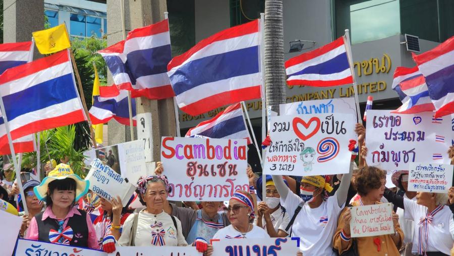 คปท. นํามวลชน ชุมนุมหน้าสถานทูตกัมพูชา หลังทหารไทยเหยียบกับระเบิดขาขาด 1 นาย บาดเจ็บอีก 2 ขณะออกลาดตระเวนช่องบกบริเวณชายแดนไทย-กัมพูชา