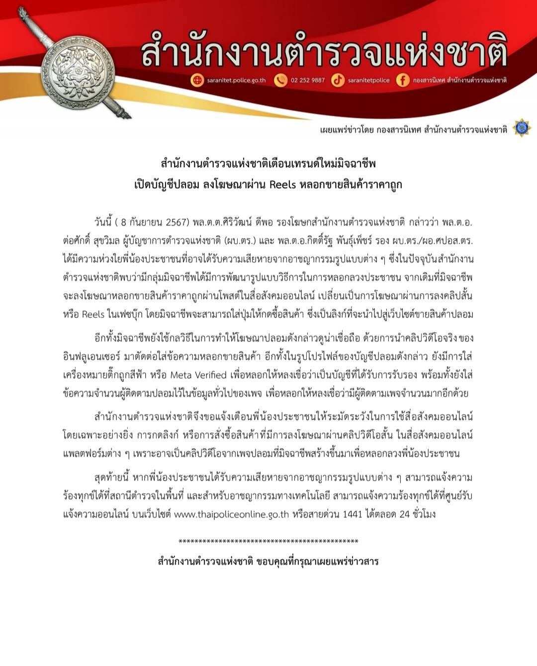 สำนักงานตำรวจแห่งชาติเตือนเทรนด์ใหม่มิจฉาชีพ เปิดบัญชีปลอม ลงโฆษณาผ่าน Reels หลอกขายสินค้าราคาถูก