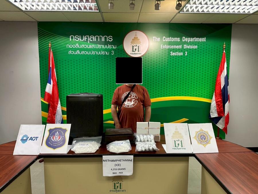 กรมศุลกากรจับชายออสเตรเลียซุกยาไอซ์ในก้อนสบู่และกระเป๋าสัมภาระ น้ำหนักรวม 4.26 กิโลกรัม มูลค่าประมาณ 1276500 บาท เตรียมออกนอกราชอาณาจักรไทยไปสู่ประเทศออสเตรเลีย