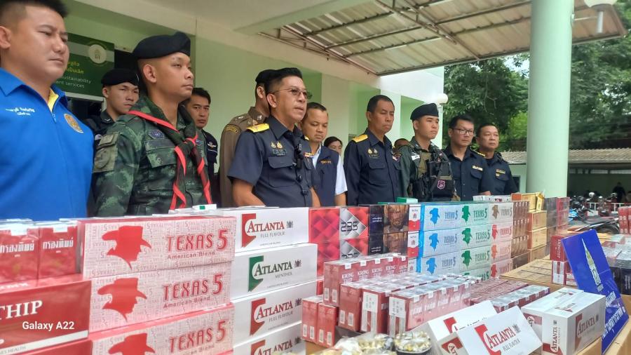 ด่านศุลกากรแม่สอด ร่วมหน่วยงาน ทหาร-ตำรวจ-ปกครอง แถลงข่าวจับบุหรี่เถื่อนและสินค้าหนีภาษี ยึดของกลางประเภทบุหรี่จํานวน 15713080 มวนมูลค่ากว่า 63 ล้านบาท