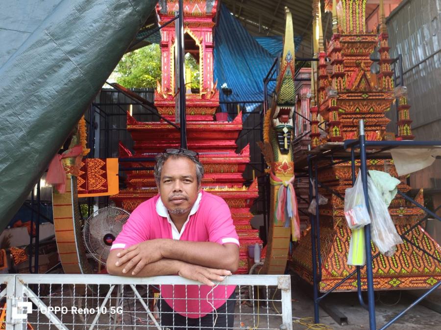ซึ่งผลงานการออกแบบลวดลายเรือ วัดหัวควน ตนทำคนเดียว แกะ ตัดคนเดียว บางช่วงอาจหาลูกมือมาช่วยติดกาวกับแม่เรือบ้าง งานแต่ละชิ้นต้องใช้เวลา บางครั้งเป็นเดือนกว่าจะแล้วเสร็จ อย่างส่วนที่ยากคือตรงยอดเรือ ซึ่งมีลวดลายเยอะ การออกแบบ เล่นสีให้เป็นมีความละเอียดและใช้ทักษะพอควร