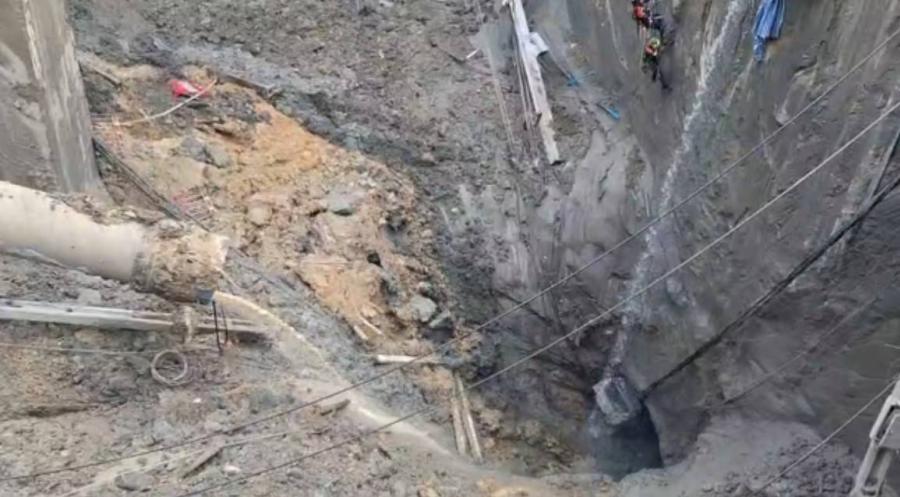 แต่ขณะใช้รถเครนโยตัวลงไป ดินด้านล่างเกิดการทรุดตัวไหลลงอีกรอบหนึ่ง ทำให้เจ้าหน้าที่ต้องสั่งให้รถเครนดึงเจ้าหน้าที่ทั้งสองคนขึ้นมาเร่งด่วน เนื่องจากหวั่นเกินอันตราย โดยตอนนี้สั่งยุตติภารกิจชั่วคราว เนื่องจากอุโมงค์ด้านล่างยังสูบดินหายไป