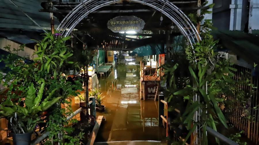 จากนั้นผู้สื่อข่าวได้ลงพื้นที่ ตลาดอิงน้ำสามโคก ซึ่งเป็นตลาดเก่าและแหล่งท่องเที่ยวชื่อดังของ จ.ปทุมธานี พบว่ามีน้ำเอ่อล้นเข้าท่วมตลาดสูง 40-50 เซนติเมตร ทำให้ร้านต่างพากันปิดและก่ออิฐพร้อมนำกระสอบทรายมากั้นเพื่อกันน้ำ