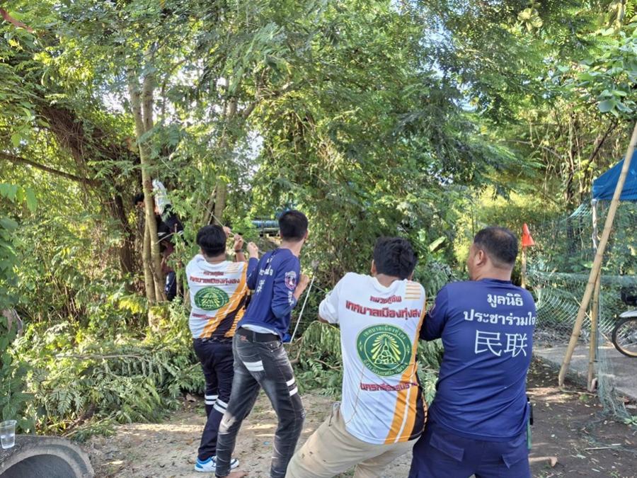 เมื่อเจ้าหน้าที่กู้ภัยมูลนิธิประชาร่วมใจทุ่งสง และกู้ภัยเทศบาลเมืองทุ่งสงไปถึง พบชายชื่อ “นายจำนงค์” อายุ 60 ปี สภาพอ่อนเพลีย เหงื่อชุ่มตัว ถูกกิ่งขี้เหล็กหนีบช่วงเข่าแน่นจนขยับไม่ได้ เจ้าหน้าที่ต้องใช้เวลานานกว่าจะช่วยลงมาได้อย่างปลอดภัย