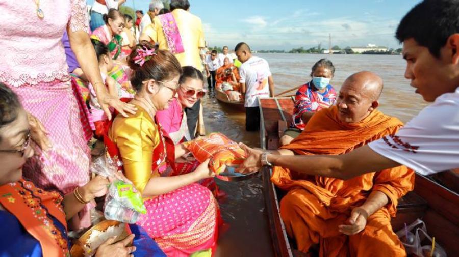 ยิ่งใหญ่อลังการตระการตา ชาวมอญรวมใจตักบาตรพระร้อย วัดชินวราราม สืบสานประเพณีเก่าแก่ ริมฝั่งแม่น้ำเจ้าพระยาเมืองปทุมธานี