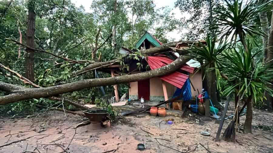 พายุฝนกระหน่ำชายแดนจังหวัดสุรินทร์ต้นไม้โค่น-หลังคาปลิวว่อน บ้านเรือน-กุฏิพระเสียหายหนัก