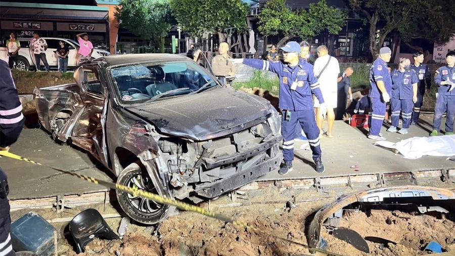 สุดเศร้าสลด!กระบะซิ่งพุ่งชนจยย.-รถจอดข้างทาง-คนงานก่อสร้างถนน ตาย 3 เจ็บ 7