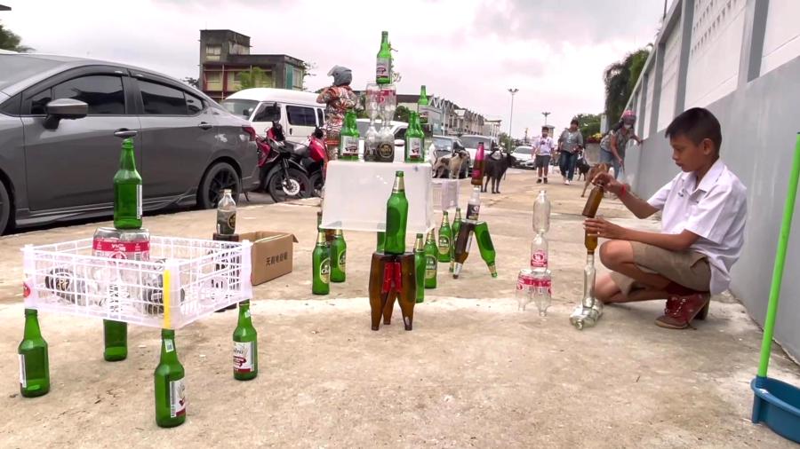 ชื่นชม 2 พี่น้องฝาแฝดแสดงโชว์เรียงขวดหารายได้ไปเรียนพิเศษ