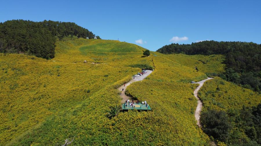นักท่องเที่ยวเทศกาลดอกบัวตองบานบนดอยแม่อูคอกระตุ้นเศรษฐกิจคึกคัก