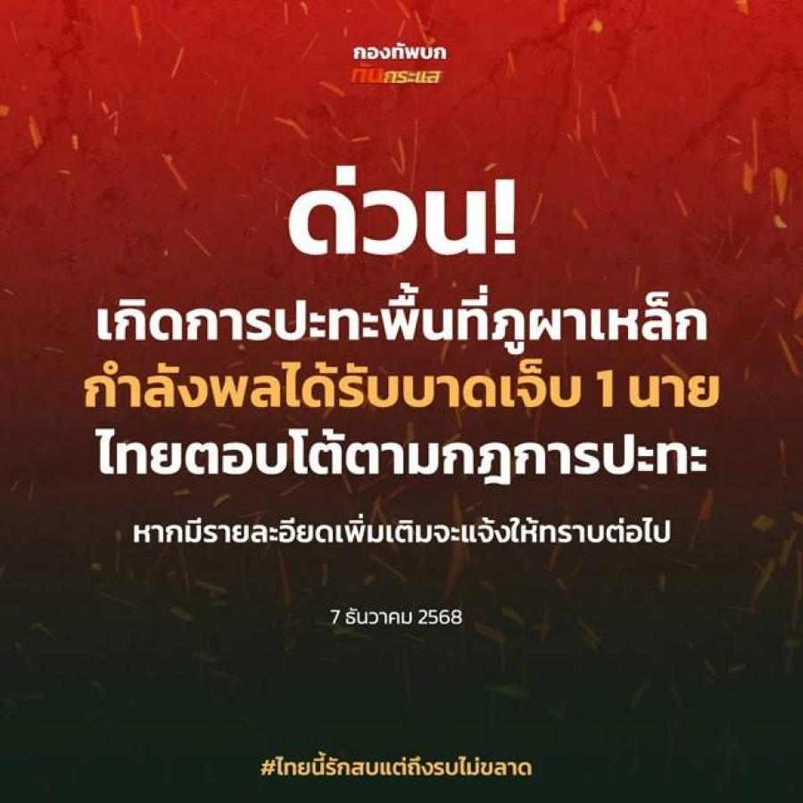 เมื่อวันที่ 7 ธ.ค.68 เพจ “กองทัพบก ทันกระแส” รายงานข่าวด่วนล่าสุด แจ้งเหตุ เกิดการปะทะพื้นที่ภูผาเหล็ก กำลังพลได้รับบาดเจ็บ 1 นาย ทหารไทยตอบโต้ตามกฎการปะทะ ทั้งนี้ ภูผาเหล็ก พลาญหินแปดก้อน ชายแดนไทย-กัมพูชา จ.ศรีสะเกษ อยู่พื้นที่กองทัพภาคที่ 2