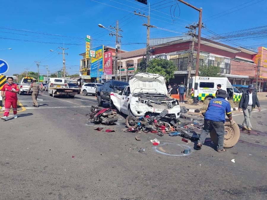 ชนวินาศสันตะโรกลางสีแยกไฟแดงเมืองอำนาจเจริญดับ 1 เจ็บ 10 ราย