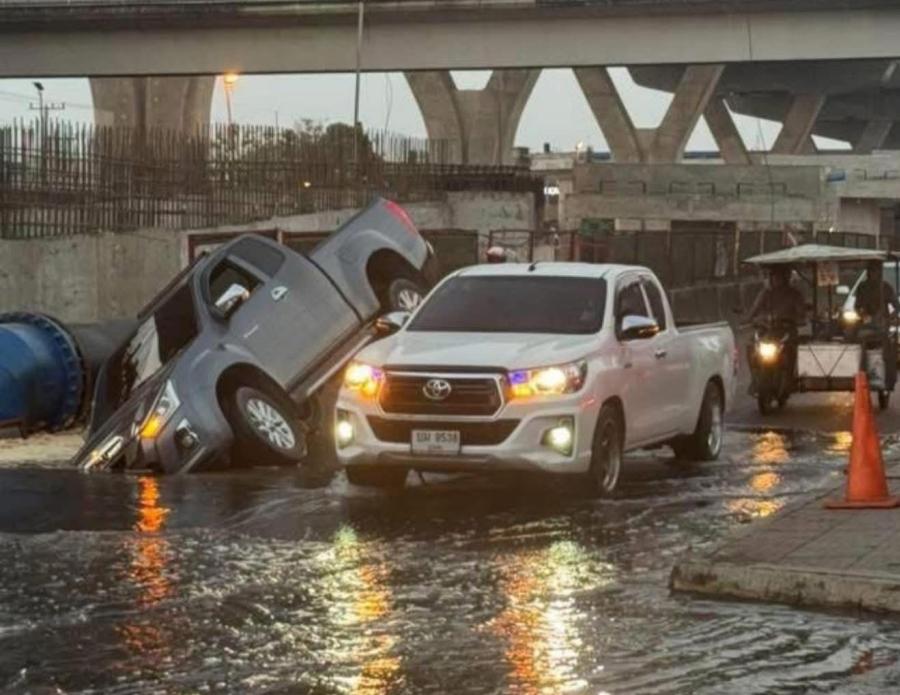 ถนนพระราม2ไม่แผ่ว!ถนนทรุดรถกระบะหัวทิ่มลงหลุมขนาดใหญ่บริเวณหน้าบิ๊กซ้ง