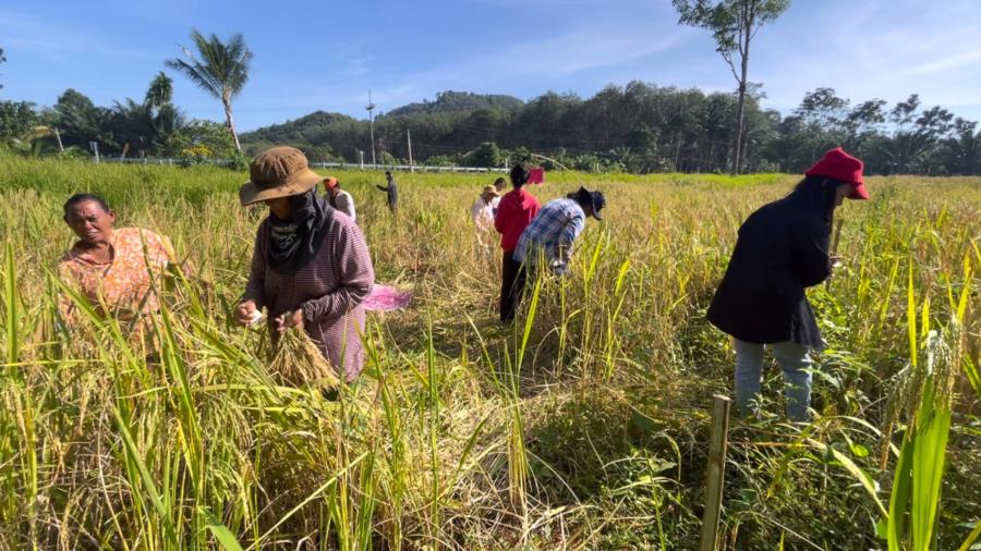 ในพื้นที่ตำบลบางดี อำเภอห้วยยอด จังหวัดตรัง ซึ่งเป็นพื้นที่แหล่งใหญ่ที่ชาวบ้านหันมาปลูกข้าว ทั้งข้าวไร่ และข้าวนา ไว้สำหรับบริโภคในครัวเรือน เพื่อลดรายจ่าย และหากเหลือก็ได้ขายสร้างรายได้เสริม โดยเฉพาะข้าวไร่นั้น ชาวบ้านนิยมปลูกในพื้นที่ว่างระหว่างร่องในสวนยางพารา และสวนปาล์มน้ำมันขนาดเล็ก ซึ่งขณะนี้อยู่ในช่วงที่ข้าวไร่กำลังทยอยสุก ทำให้ชาวบ้านต้องเร่งเก็บเกี่ยว ทั้งนี้ พบว่า ญาติพี่น้อง รวมทั้งเพื่อนบ้านกลุ่มหนึ่ง ได้ช่วยกันลงแขกเกี่ยวข้าวไร่ที่กำลังสุกเหลืองอร่าม หลังจากประสบปัญหาเรื่องขาดแคลนรถเกี่ยวข้าว