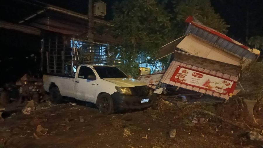 ฝนตกถนนลื่นกระบะเสียหลักพุ่งชนร้านค้าริมทางเสียหายยับโชคดีไร้เจ็บตาย