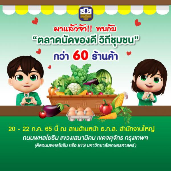 ธ.ก.ส. รวบรวมสินค้าเกษตรและผลิตภัณฑ์ชุมชนจากเกษตรกรลูกค้า กว่า 60 ร้านค้า จัดตลาดนัดของดีวิถีชุมชน ประจำเดือนกรกฎาคม 2565 เพิ่มช่องทางการจำหน่ายสินค้า สร้างอาชีพ สร้างรายได้ แก่เกษตรกรลูกค้า วิสาหกิจชุมชนและผู้ประกอบการ SMEs เกษตร วันที่ 20 - 22 กรกฎาคมนี้ ณ บริเวณด้านหน้า ธ.ก.ส. สำนักงานใหญ่ กรุงเทพมหานคร