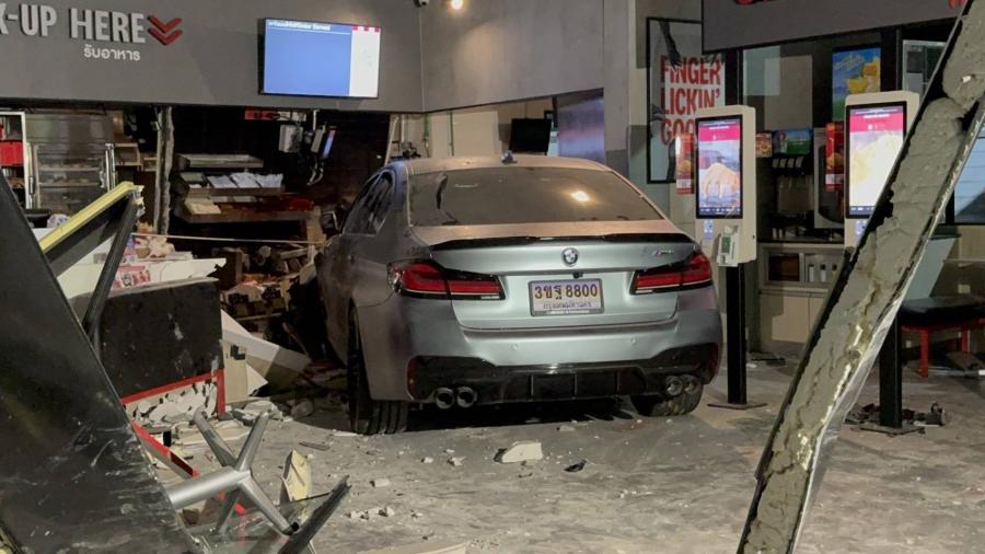 ที่เกิดเหตุพบรถยนต์เก๋งยี่ห้อ BMW สีบรอนซ์เทา ทะเบียน 3ขฐ 8800 กรุงเทพมหานคร สภาพพุ่งอัดเข้าไปภายในร้าน KFC จนได้รับความเสียหายอย่างหนัก กระจกแตก โต๊ะ เก้าอี้ และเคาน์เตอร์พังยับเยิน นอกจากนี้ยังพบรถยนต์เก๋ง โตโยต้า แคมรี สีครีม ทะเบียน ภม 6546 กรุงเทพมหานคร ซึ่งจอดรอเติมน้ำมันอยู่บริเวณหน้าปั๊ม ถูกชนท้ายฝั่งซ้ายได้รับความเสียหาย ก่อนรถ BMW จะเสียหลักพุ่งเข้าไปในร้าน