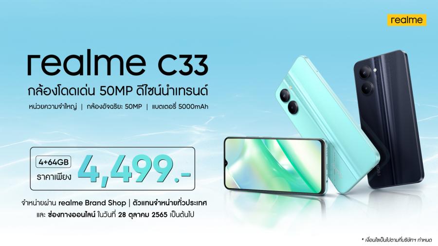 กรุงเทพฯ 27 ตุลาคม 2565 - realme (เรียลมี) แบรนด์เทคโนโลยีเพื่อคนรุ่นใหม่ที่เติบโตเร็วที่สุดในโลก จัดงานฉลอง First Sale สมาร์ตโฟนรุ่นใหม่ล่าสุดในตระกูล C Series “realme C33” ที่สร้างกระแสฮือฮาจากสุดยอดงานดีไซน์ที่หรูหรางดงามดังระลอกคลื่นน้ำแห่งท้องทะเล บวกกับขุมพลังกล้องล้ำนำเทรนด์กว่า 50 ล้านพิกเซล โดย “realme C33” นำเสนอรุ่นความจุ 4/64GB ในราคาเริ่มต้น 4499 บาท เริ่มวางจำหน่ายตั้งแต่วันที่ 28 ตุลาคมนี้ ที่ realme Brand Shop ทุกสาขาและร้านค้าดีลเลอร์ของแบรนด์ รวมถึงร้านค้าออนไลน์ชื่อดังทั้ง Shopee Lazada และ JD Central โดยมาพร้อมแก็ดเจ็ตสุดล้ำที่จะเติมเต็มไลฟ์สไตล์ยุคดิจิทัลให้สมบูรณ์แบบกับ “realme Buds T100” หูฟังบลูทูธกับดีไซน์สุดคูลด้วยโทนสีแบบ Two Tone พิเศษ! สุดคุ้มกับราคาโปรโมชั่นฉลองการเปิดตัวเพียง 499 บาท จาก 699 บาท ตั้งแต่ 28 ตุลาคม – 3 พฤศจิกายนนี้ วางจำหน่ายเฉพาะช่องทางออนไลน์ที่ Shopee เท่านั้น