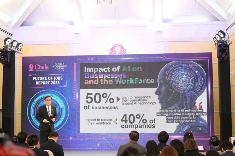 ศาสตราจารย์ ดร.วิเลิศ ภูริวัชร อธิการบดี จุฬาลงกรณ์มหาวิทยาลัย แถลงข้อมูลรายงาน “Future of Jobs 2025” ซึ่งจุฬาลงกรณ์มหาวิทยาลัยเป็นตัวแทนหนึ่งเดียวในประเทศไทยร่วมกับ World Economic Forum ในการเสนอแนวทางเพื่อรับมือการเปลี่ยนแปลงของตลาดแรงงานในระหว่างปี พ.ศ. 2568–2573