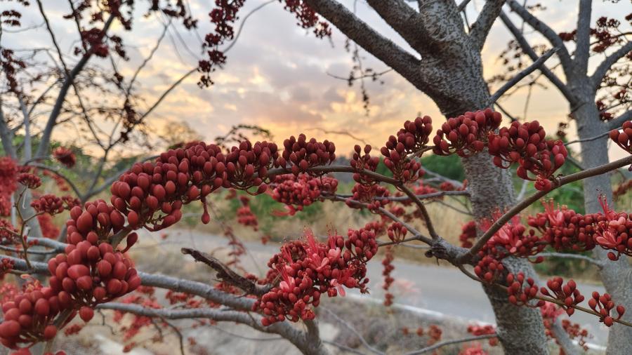 สำหรับต้นประดู่แดงนั้น เป็นพรรณไม้ยืนต้นขนาดกลางถึงขนาดใหญ่มีความสูงประมาณ 10 -12 เมตร ผิวเปลือกลำต้นมีสีน้ำตาลอ่อน เรือนยอดแผ่กว้างกิ่งลู่ลง ผลัดใบ ใบเป็นรูปมนรีออกเป็นคู่ สลับกันตามลำต้น ลักษณะของใบปลายแหลม โคนใบมน ขอบใบเรียบ มีสีเขียว ออกดอกเป็นช่อ ช่อดอกสีแดงสด ดอกจะบานไม่พร้อมกัน จะทยอยกันบานไล่ขึ้นไปตั้งแต่โคนก้านช่อจนถึงปลายช่อ เวลาบานจะแดงสะพรั่งทั้งต้น เกสรยาวยื่นออกมากลางดอก ดอกมีกลิ่นหอม ออกดอกช่วงเดือนมกราคม – มีนาคม.